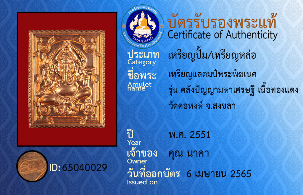 Amulet name : Ganesha stamp coin, Treasury of Panya Billionaire series, copper