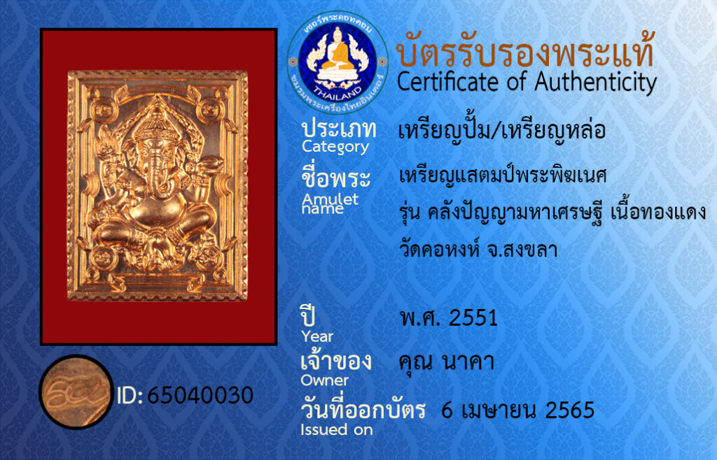 ชื่อพระ : เหรียญแสตมป์พระพิฆเนศ รุ่น คลังปัญญามหาเศรษฐี เนื้อทองแดง วัดคอหงห์ จ.สงขลา