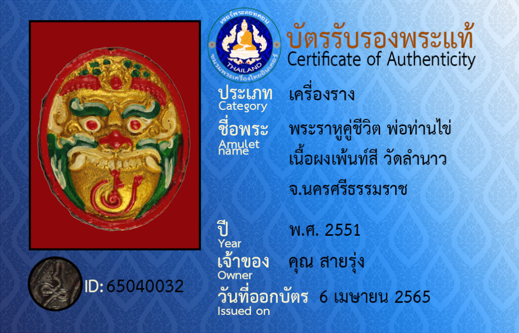ชื่อพระ : พระราหูคู่ชีวิต พ่อท่านไข่ เนื้อผงเพ้นท์สี วัดลำนาว จ.นครศรีธรรมราช