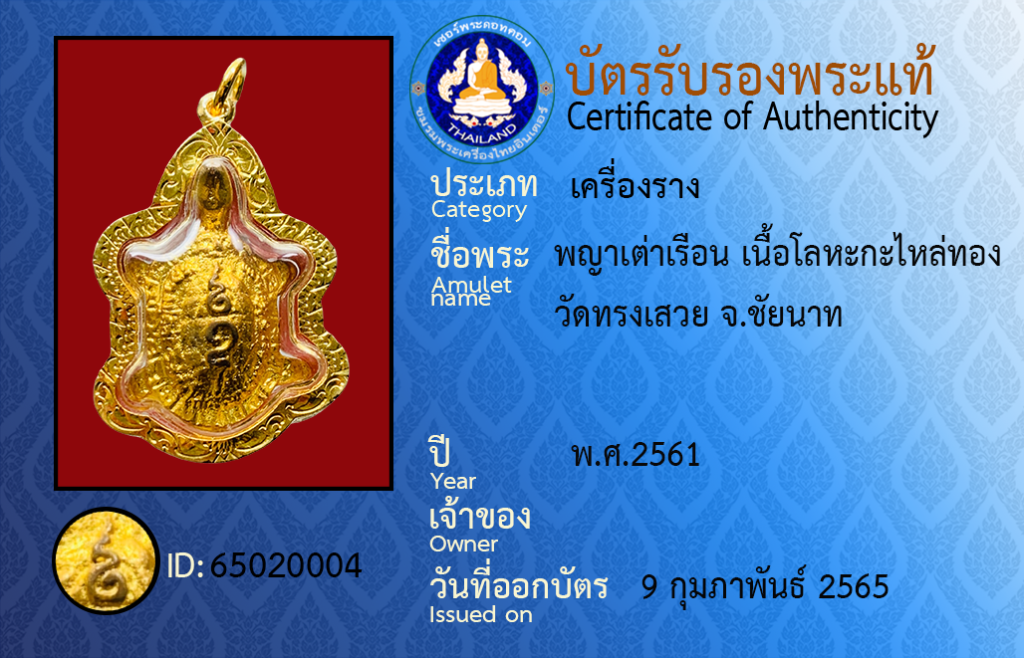 ชื่อพระ : พญาเต่าเรือน เนื้อโลหะกะไหล่ทอง วัดทรงเสวย จ.ชัยนาท