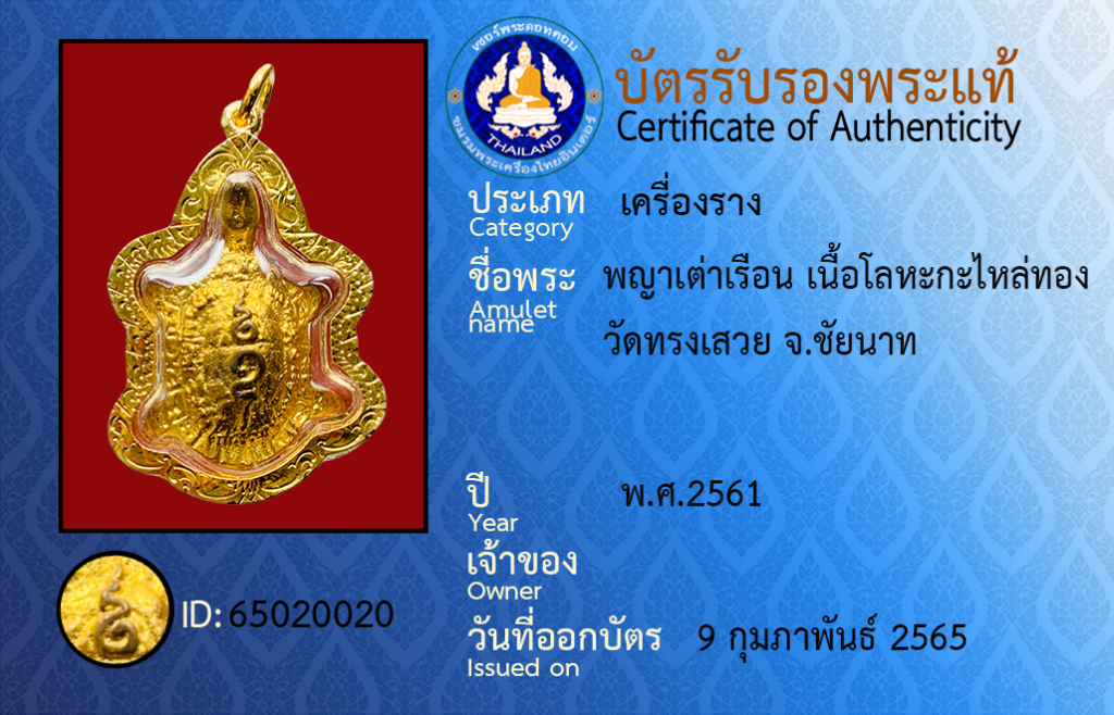 ชื่อพระ : พญาเต่าเรือน เนื้อโลหะกะไหล่ทอง วัดทรงเสวย จ.ชัยนาท