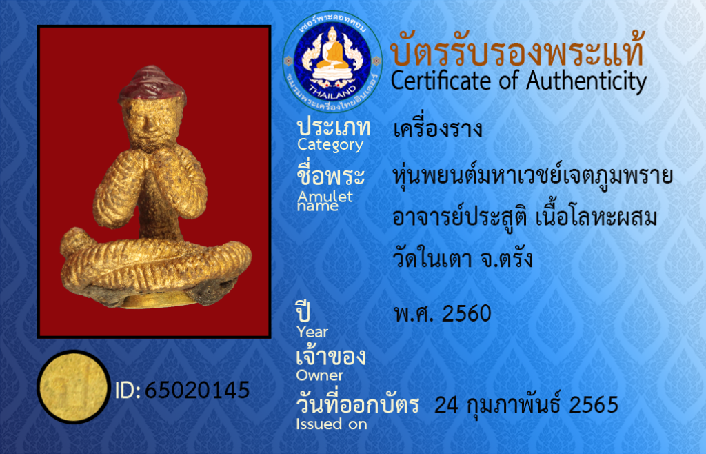 ชื่อพระ : หุ่นพยนต์มหาเวชย์เจตภูมิพราย อาจารย์ประสูติ เนื้อโลหะผสม วัดในเตา จ.ตรัง