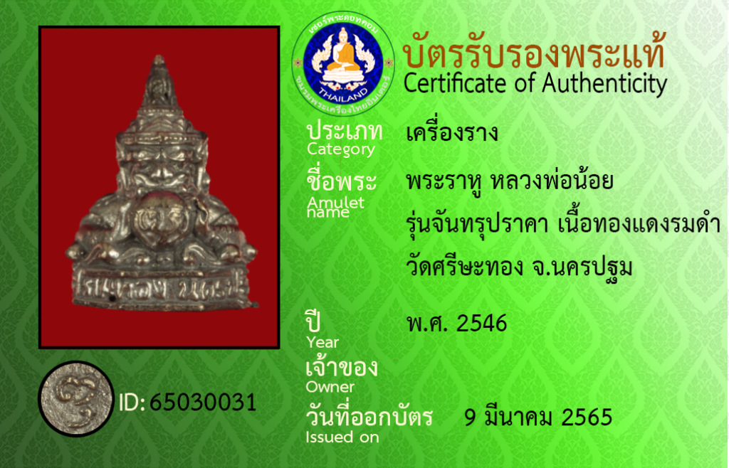 Amulet name : Phra RaHu,Luang Pho Noi,Run Chantharupparakha,Nuea Thongdaeng RomDam,Wat Sisa Thong,Nakhon Pathom
