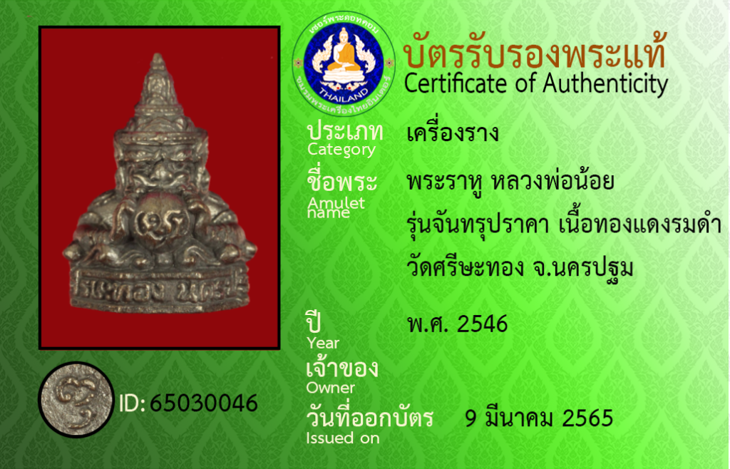 Amulet name : Phra RaHu,Luang Pho Noi,Run Chantharupparakha,Nuea Thongdaeng RomDam,Wat Sisa Thong,Nakhon Pathom