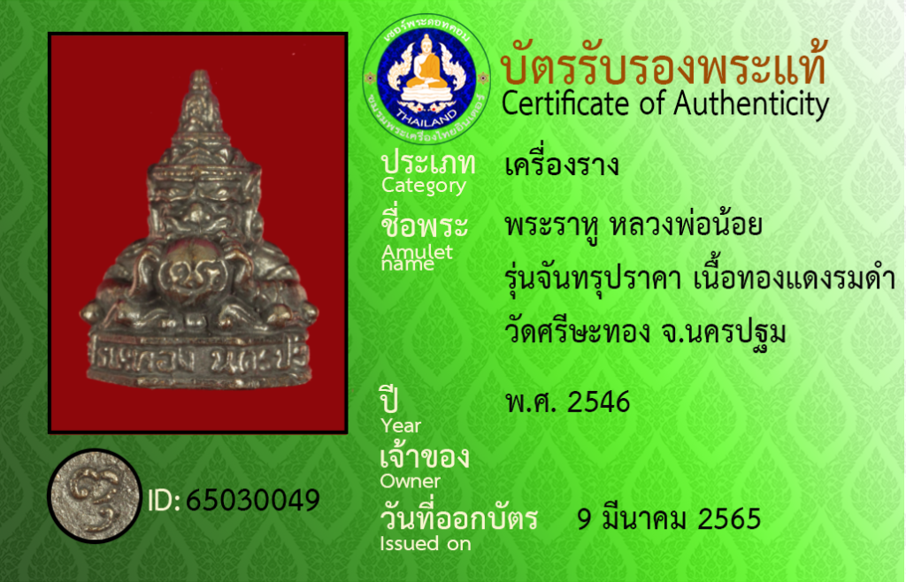 Amulet name : Phra RaHu,Luang Pho Noi,Run Chantharupparakha,Nuea Thongdaeng RomDam,Wat Sisa Thong,Nakhon Pathom
