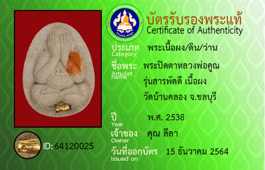 Amulet name : Phra Pit Ta Luang Pho Khun ,Run Saraphat Di ,Wat Ban Khlong ,Chon Buri