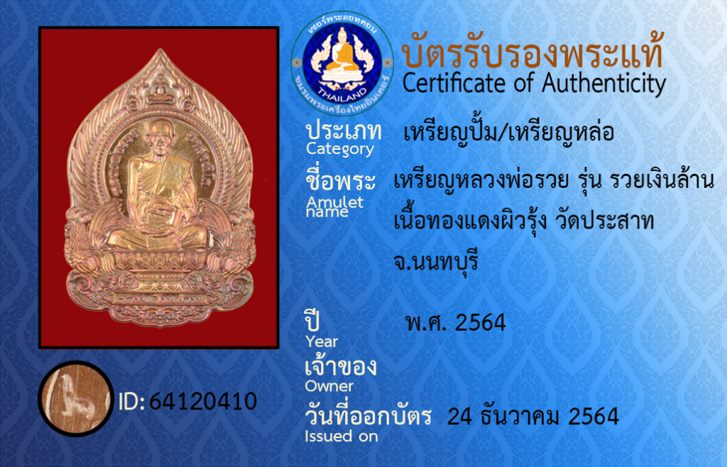 Amulet name : Rian Luang Pho Ruai, Run Ruai Ngoen Lan,Wat Prasat,Nonthaburi