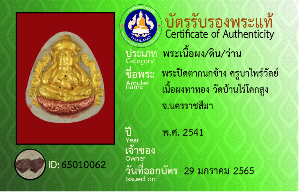 ชื่อพระ : พระปิดตากนกข้าง ครูบาไพรวัลย์ เนื้อผงทาทอง วัดบ้านไร่โคกสูง จ.นครราชสีมา