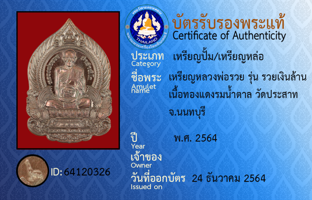 Amulet name : Rian Luang Pho Ruai, Run Ruai Ngoen Lan,Wat Prasat,Nonthaburi