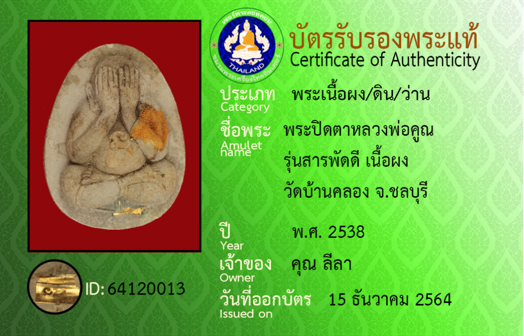 Amulet name : Phra Pit Ta Luang Pho Khun ,Run Saraphat Di ,Wat Ban Khlong ,Chon Buri