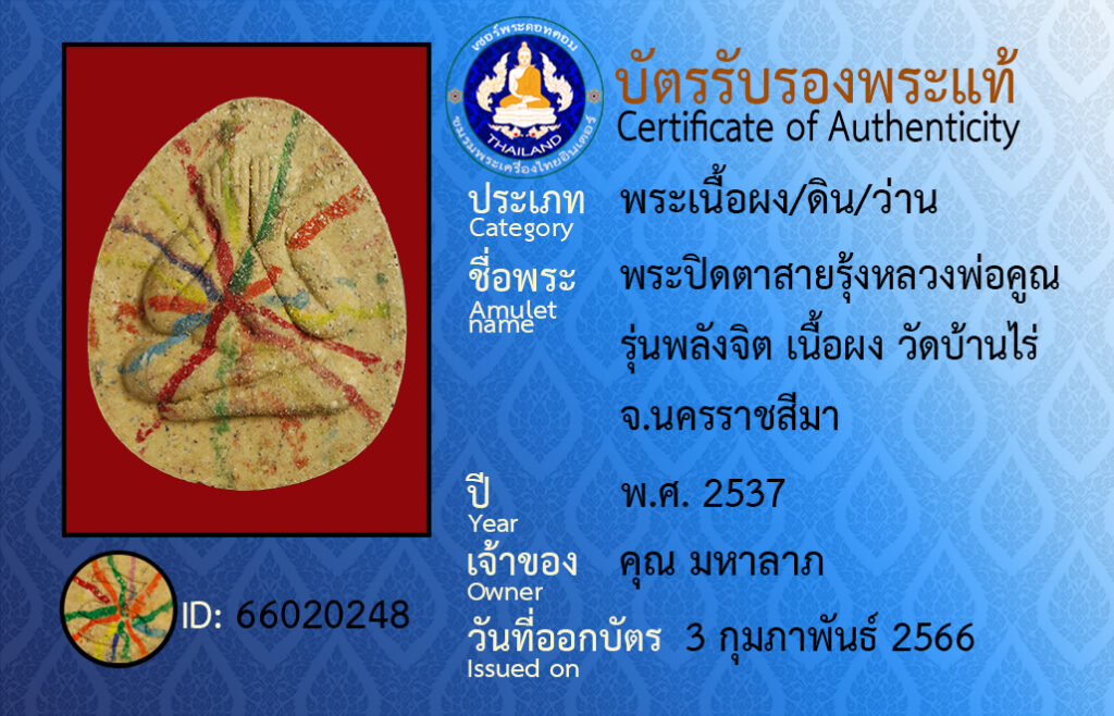 Amulet name :Phra pid ta sayrung luang por Koon run phalngcit neua pong Wat Ban Rai Nakhon Ratchasima
