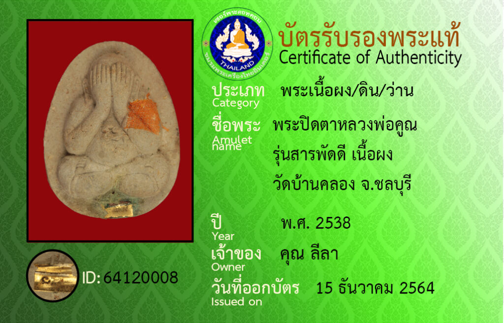 Amulet name : Phra Pit Ta Luang Pho Khun ,Run Saraphat Di ,Wat Ban Khlong ,Chon Buri