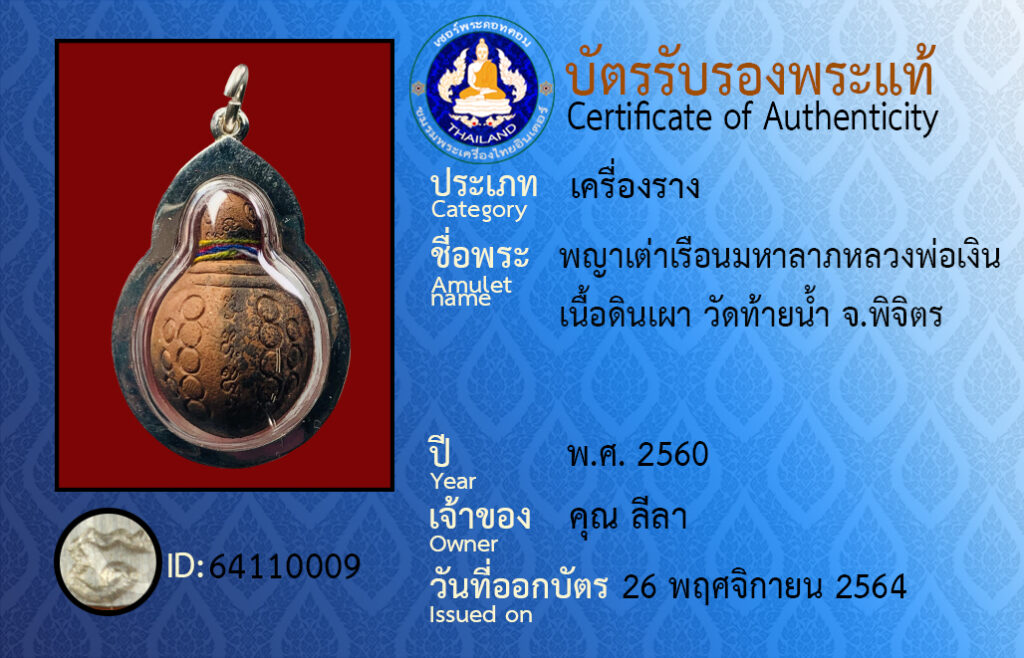 Amulet name : pra ya dtao reuan ma ha lap luang por ngern , wat tai nam