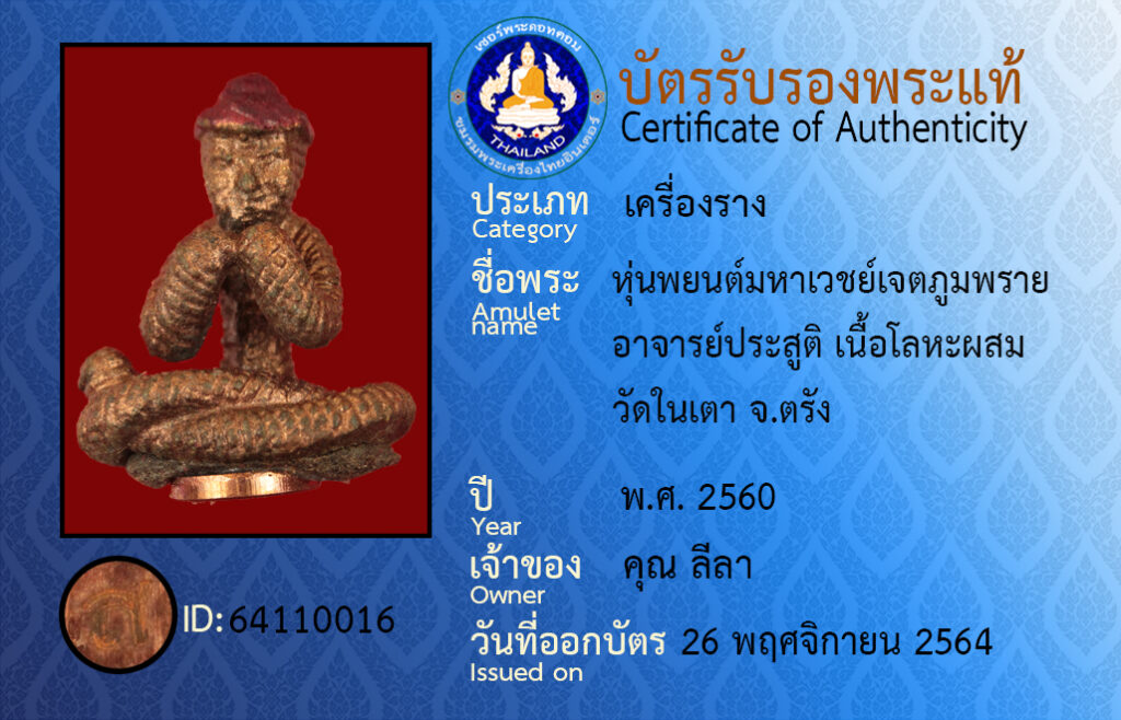 ชื่อพระ : หุ่นพยนต์มหาเวทย์เจตภูมิพราย อาจารย์ประสูติ เนื้อโลหะผสม วัดในเตา จ.ตรัง