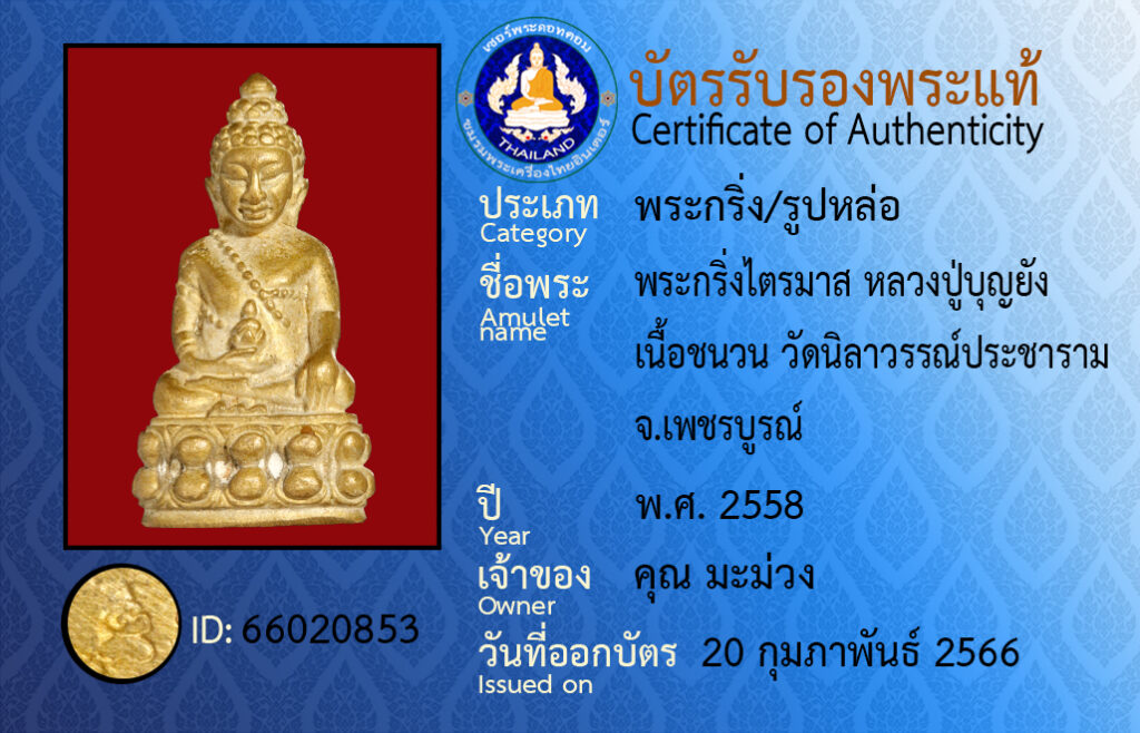 Amulet name :pra kring dtrai maat luang bpoo bun yang neua cha nuan wat ni la wan bpra chaa raam pet cha boon