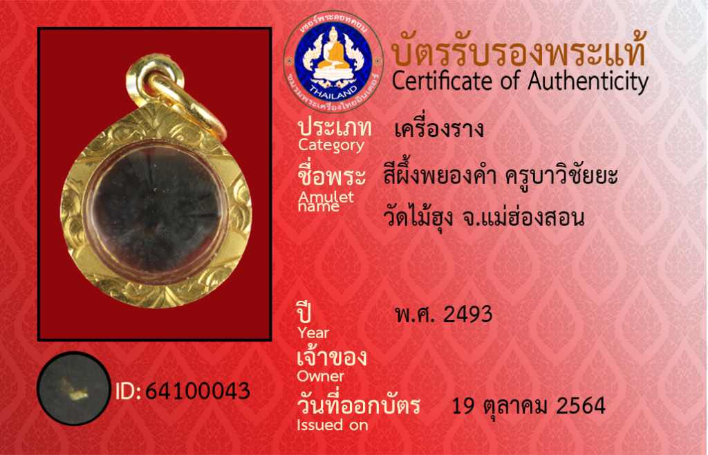 ชื่อพระ : สีผึ้งพยองคำ ครูบาวิชัยยะ วัดไม้ฮุง จ.แม่ฮองสอน