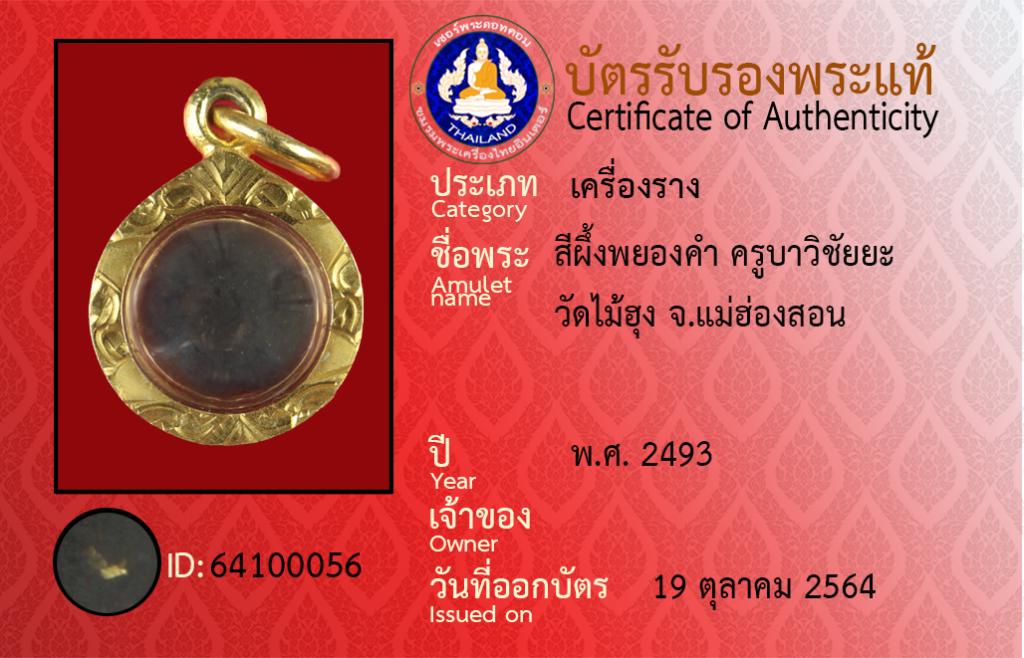 ชื่อพระ : สีผึ้งพยองคำ ครูบาวิชัยยะ วัดไม้ฮุง จ.แม่ฮองสอน