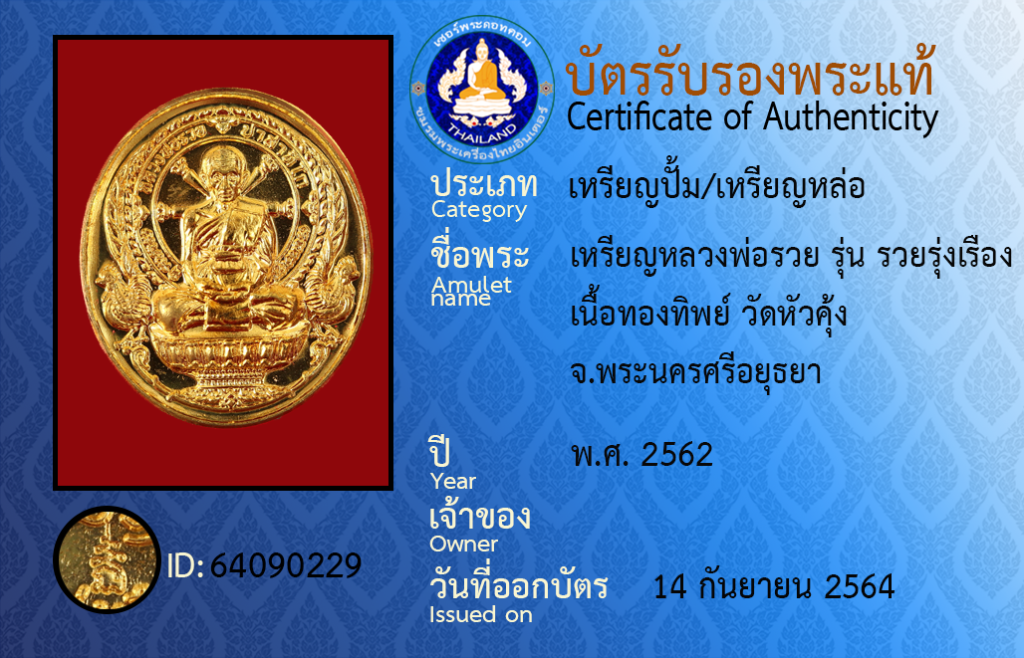 ชื่อพระ : เหรียญหลวงพ่อรวย รุ่น รวยรุ่งเรือง เนื้อทองทิพย์ วัดหัวคุ้ง จ.พระนครศรีอยุธยา