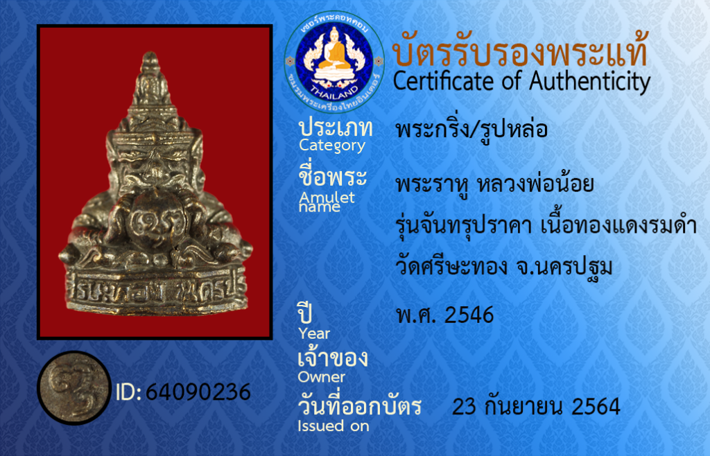 ชื่อพระ : พระราหู หลวงพ่อน้อย รุ่นจันทรุปราคา เนื้อทองแดงรมดำ วัดศรีษะทอง จ.นครปฐม