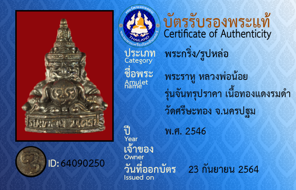 ชื่อพระ : พระราหู หลวงพ่อน้อย รุ่นจันทรุปราคา เนื้อทองแดงรมดำ วัดศรีษะทอง จ.นครปฐม
