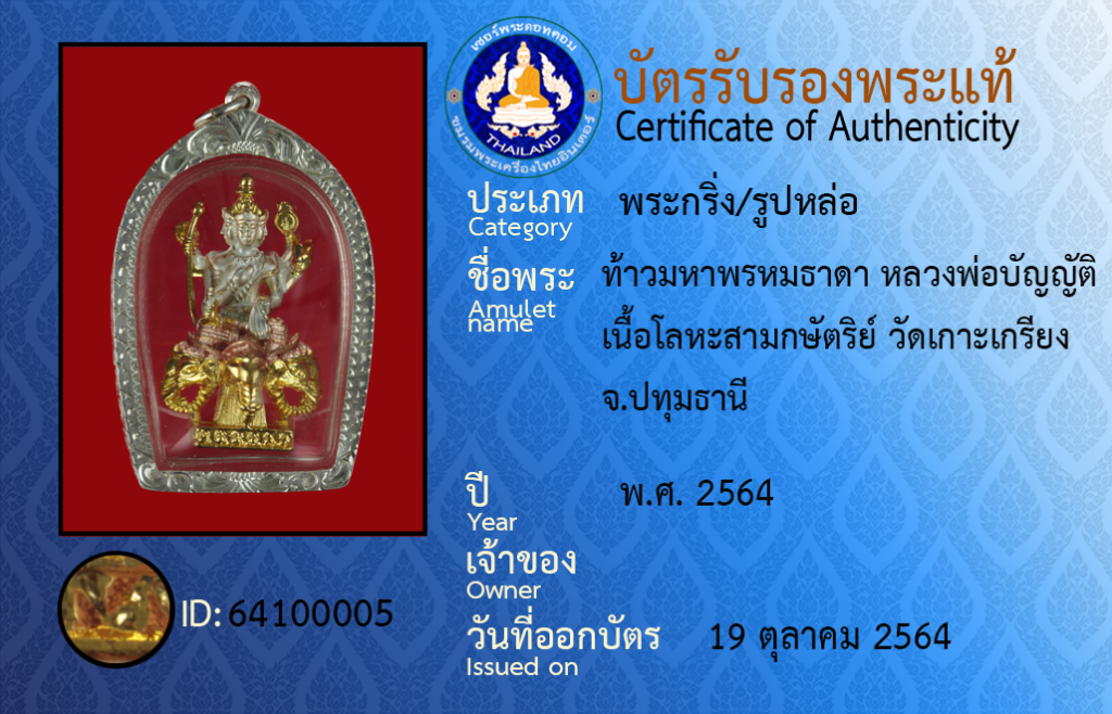 ชื่อพระ : ท้าวมหาพรหมธาดา หลวงพ่อบัญญัติ เนื้อโลหะสามกษัตริย์ วัดเกาะเกรียง จ.ปทุมธานี