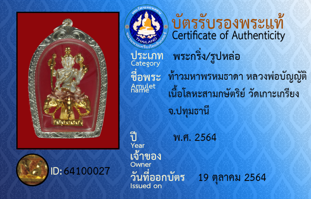 ชื่อพระ : ท้าวมหาพรหมธาดา หลวงพ่อบัญญัติ เนื้อโลหะสามกษัตริย์ วัดเกาะเกรียง จ.ปทุมธานี