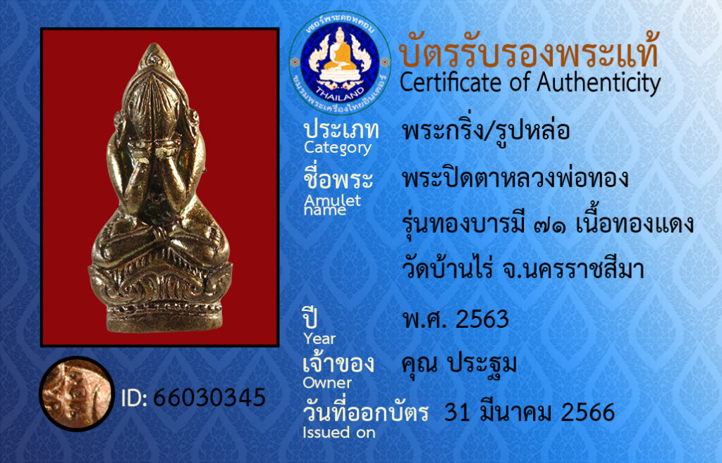 Amulet name : phra pit ta luang por tong run tong ba ra mee ๗๑ neua tong dang wat ban rai Nakhon ratchasima