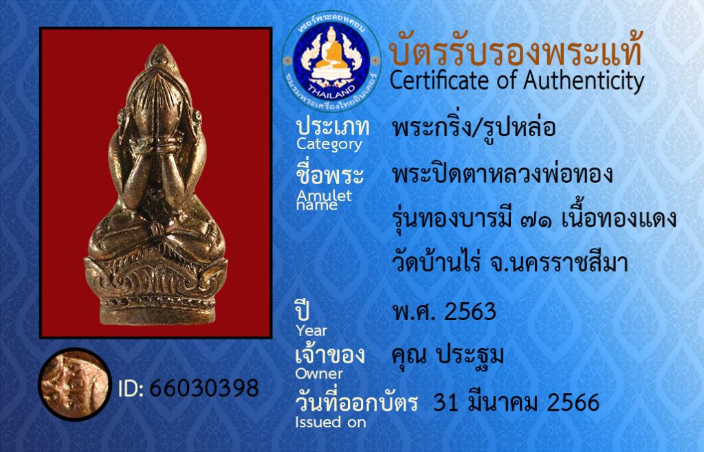 ชื่อพระ :พระปิดตาหลวงพ่อทอง รุ่นทองบารมี ๗๑ เนื้อทองแดง วัดบ้านไร่ จ.นครราชสีมา