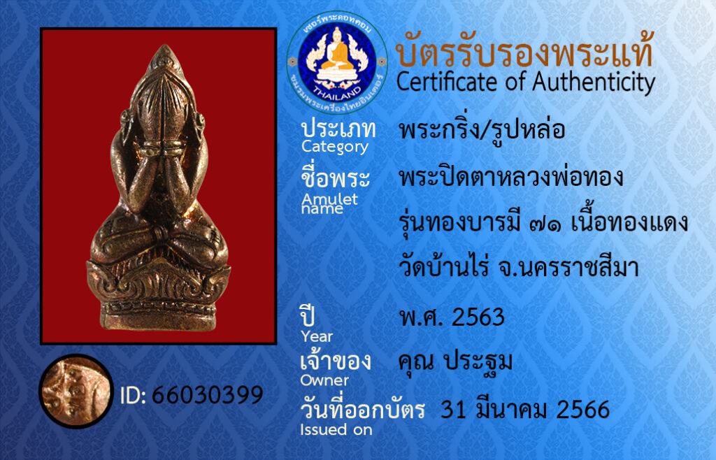 Amulet name : phra pit ta luang por tong run tong ba ra mee ๗๑ neua tong dang wat ban rai Nakhon ratchasima