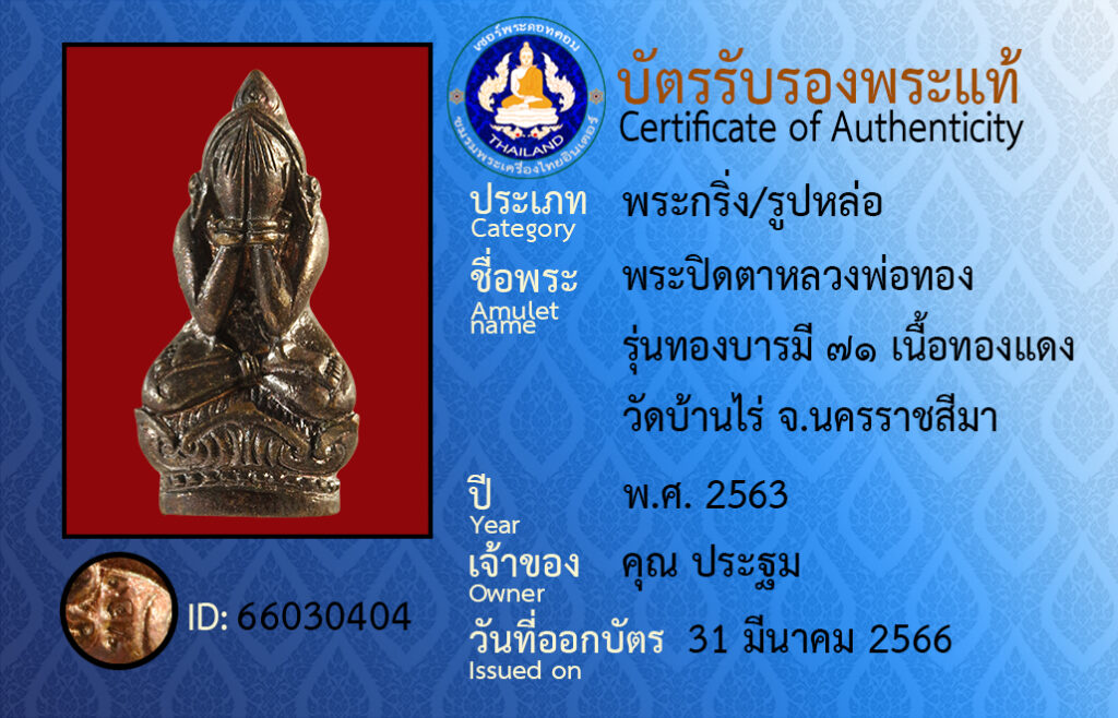 ชื่อพระ :พระปิดตาหลวงพ่อทอง รุ่นทองบารมี ๗๑ เนื้อทองแดง วัดบ้านไร่ จ.นครราชสีมา