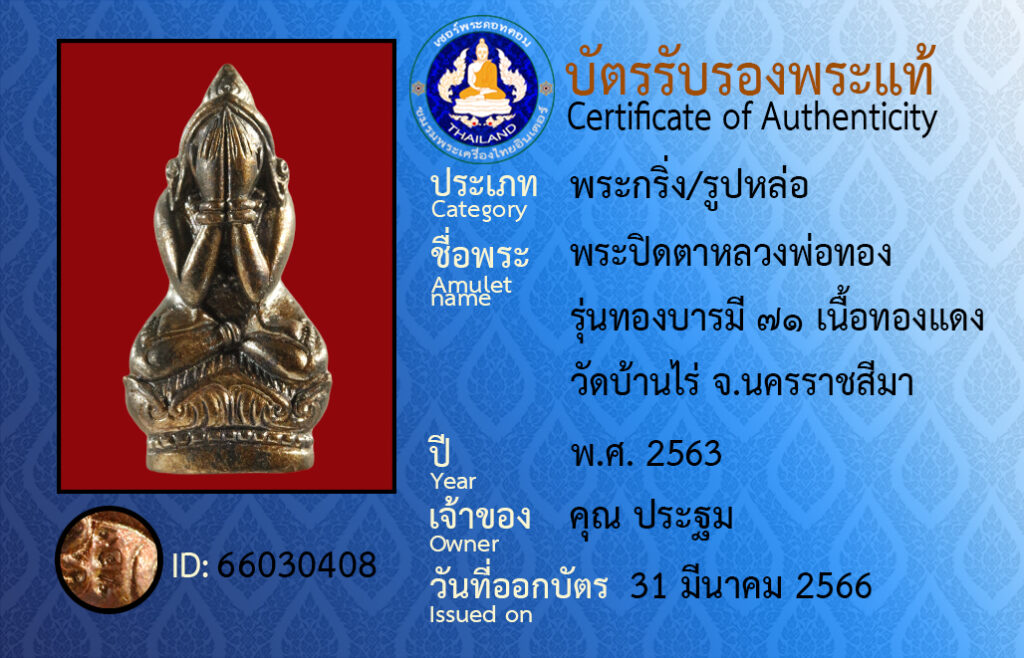 Amulet name : phra pit ta luang por tong run tong ba ra mee ๗๑ neua tong dang wat ban rai Nakhon ratchasima