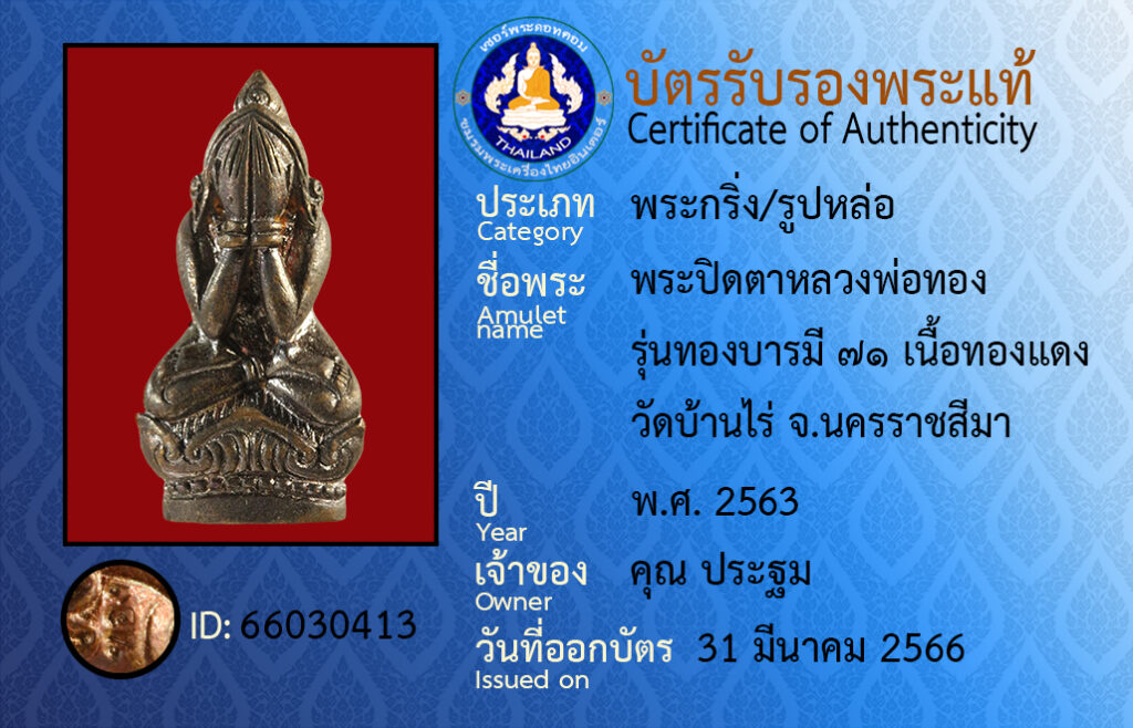 Amulet name : phra pit ta luang por tong run tong ba ra mee ๗๑ neua tong dang wat ban rai Nakhon ratchasima