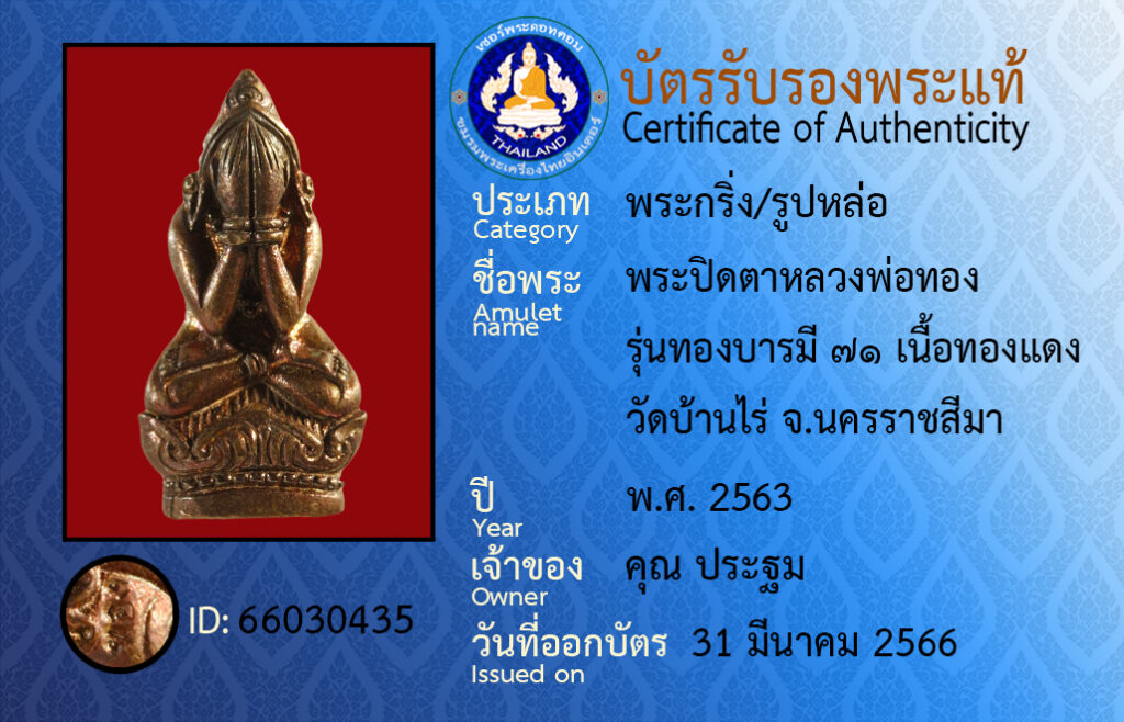 ชื่อพระ :พระปิดตาหลวงพ่อทอง รุ่นทองบารมี ๗๑ เนื้อทองแดง วัดบ้านไร่ จ.นครราชสีมา