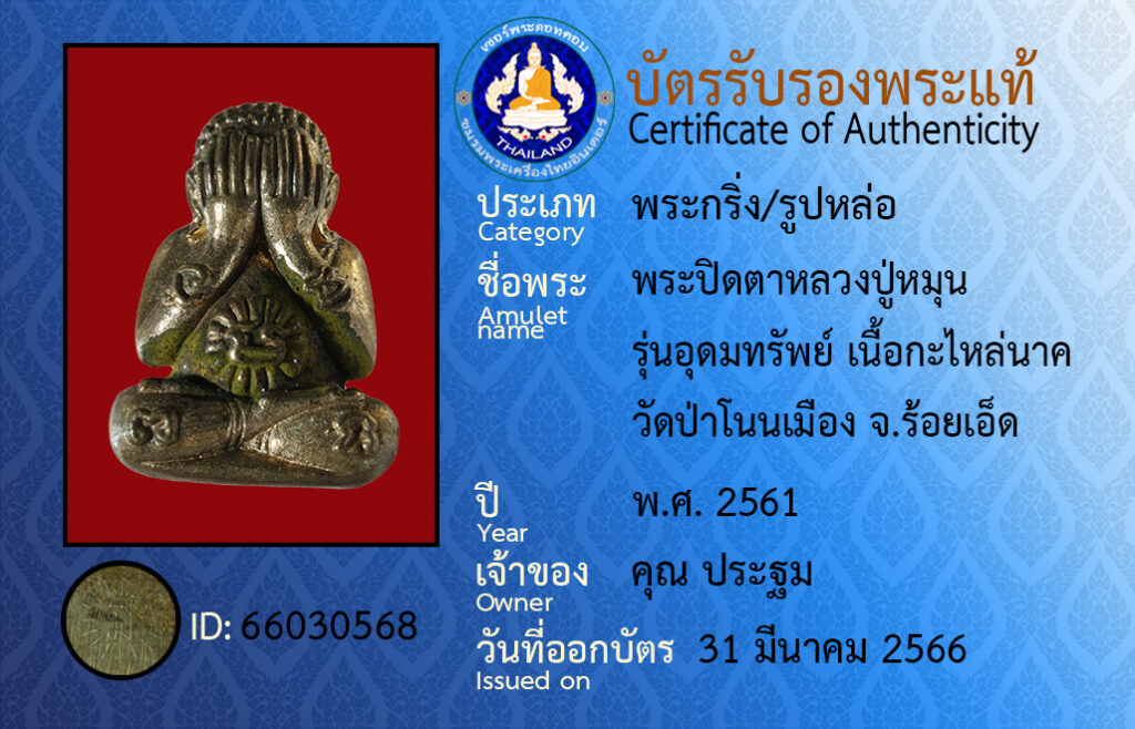 Amulet name : phra pit ta luang pu mun run u domsap neua ka rai nak wat pa non meung roy et
