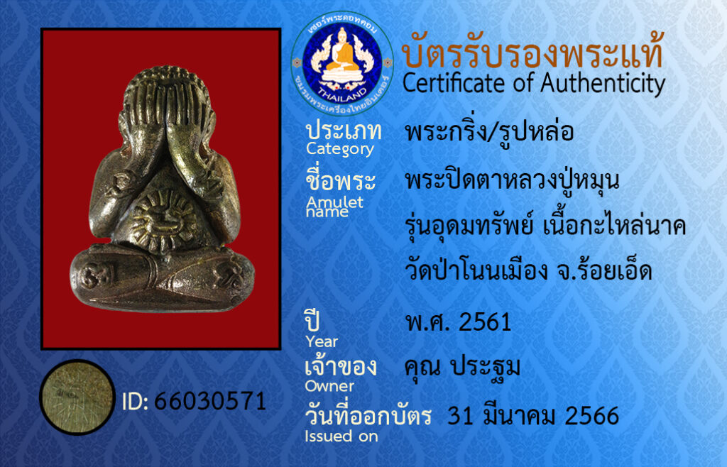 Amulet name : phra pit ta luang pu mun run u domsap neua ka rai nak wat pa non meung roy et