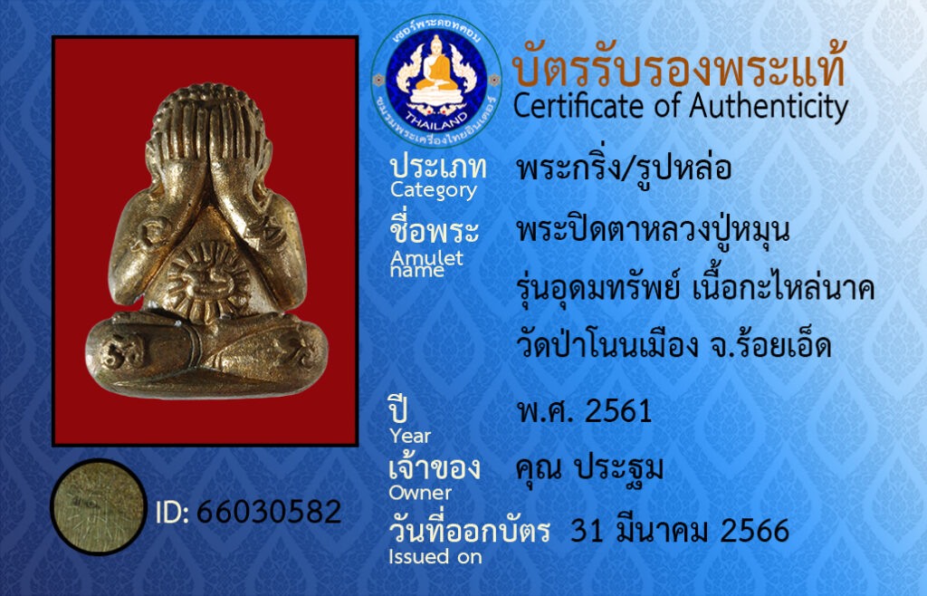 Amulet name : phra pit ta luang pu mun run u domsap neua ka rai nak wat pa non meung roy et