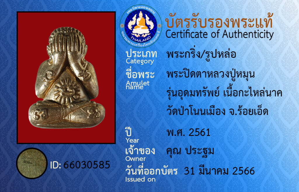 Amulet name : phra pit ta luang pu mun run u domsap neua ka rai nak wat pa non meung roy et
