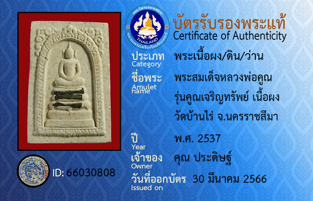 ชื่อพระ :พระสมเด็จหลวงพ่อคุณ รุ่นคุณเจริญทรัพย์ เนื้อผง วัดบ้านไร่ จ.นครราชสีมา
