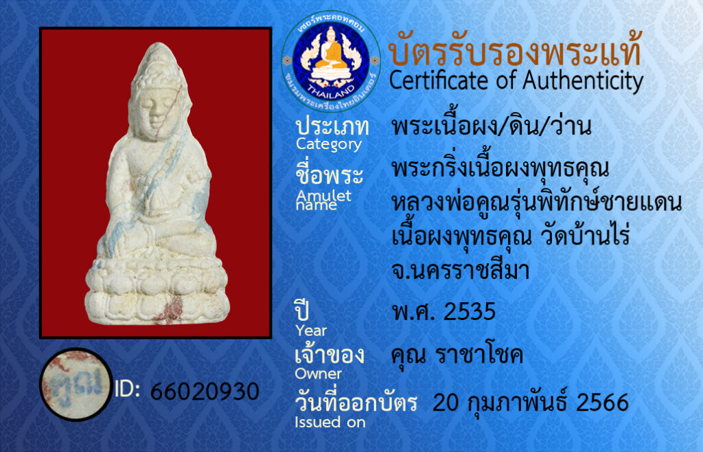 Amulet name :pra kring neua pong put ta kun luang por koon run pi tak chai daen neua pong put kun wat baan rai na kon raat see ma