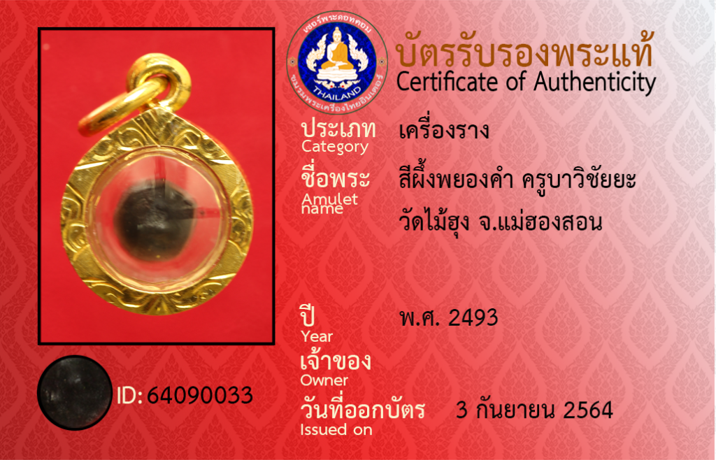 ชื่อพระ : สีผึ้งพยองคำ ครูบาวิชัยยะ วัดไม้ฮุง จ.แม่ฮองสอน