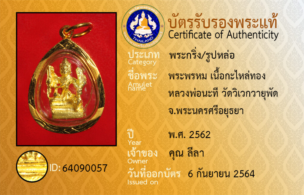 ชื่อพระ : พระพรหม เนื้อกะไหล่ทอง หลวงพ่อนะที วัดวิเวกวายุพัด จ.พระนครศรีอยุธยา