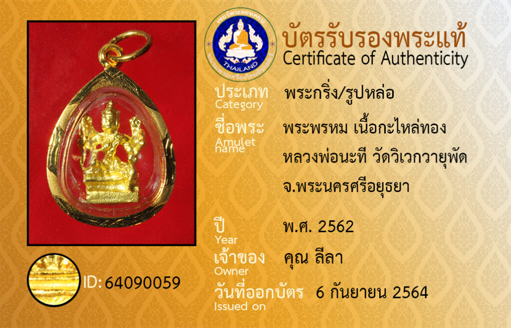 ชื่อพระ : พระพรหม เนื้อกะไหล่ทอง หลวงพ่อนะที วัดวิเวกวายุพัด จ.พระนครศรีอยุธยา