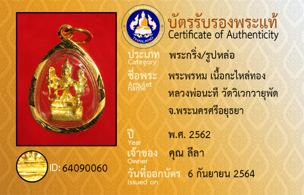 ชื่อพระ : พระพรหม เนื้อกะไหล่ทอง หลวงพ่อนะที วัดวิเวกวายุพัด จ.พระนครศรีอยุธยา