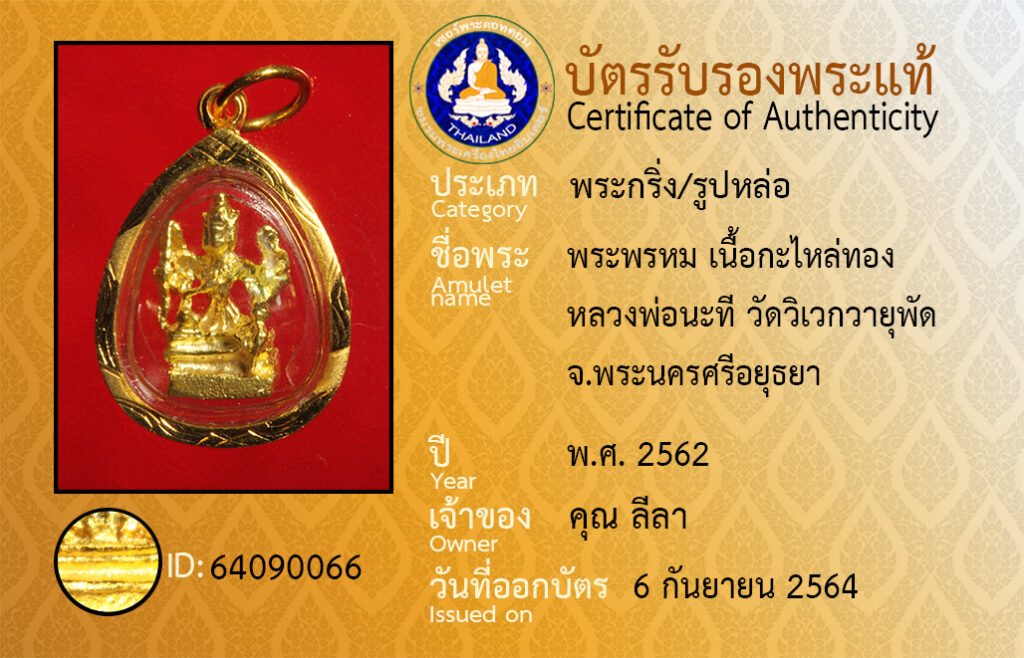 ชื่อพระ : พระพรหม เนื้อกะไหล่ทอง หลวงพ่อนะที วัดวิเวกวายุพัด จ.พระนครศรีอยุธยา