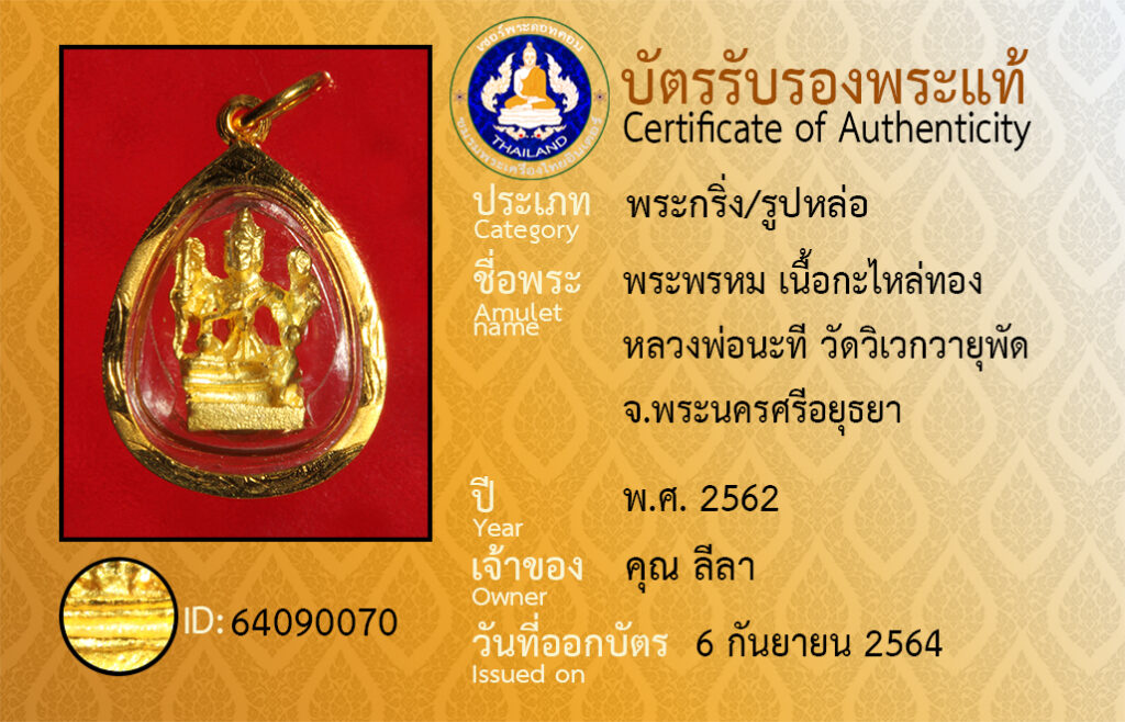 ชื่อพระ : พระพรหม เนื้อกะไหล่ทอง หลวงพ่อนะที วัดวิเวกวายุพัด จ.พระนครศรีอยุธยา