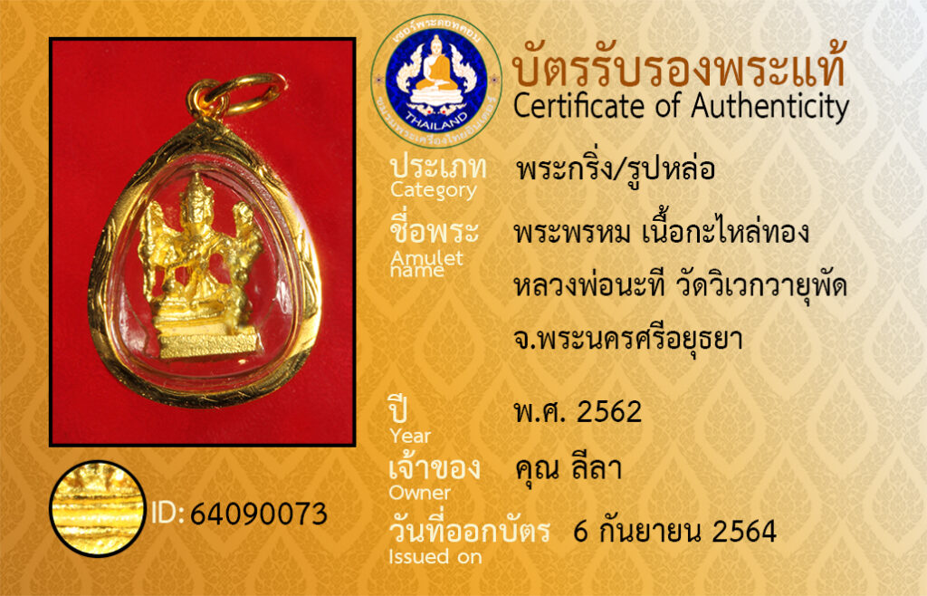 ชื่อพระ : พระพรหม เนื้อกะไหล่ทอง หลวงพ่อนะที วัดวิเวกวายุพัด จ.พระนครศรีอยุธยา