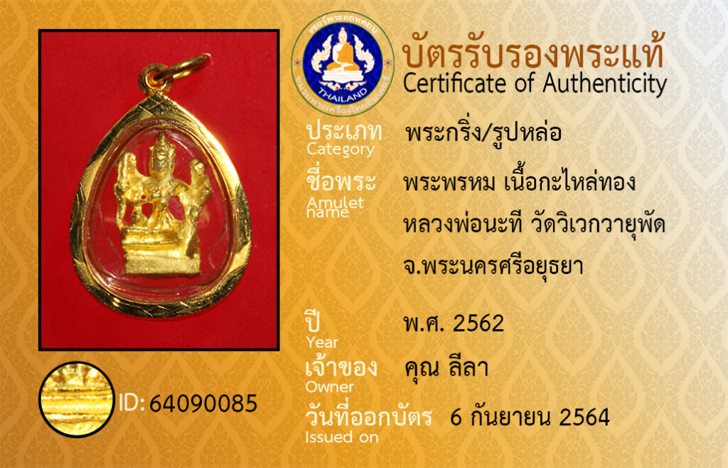 ชื่อพระ : พระพรหม เนื้อกะไหล่ทอง หลวงพ่อนะที วัดวิเวกวายุพัด จ.พระนครศรีอยุธยา