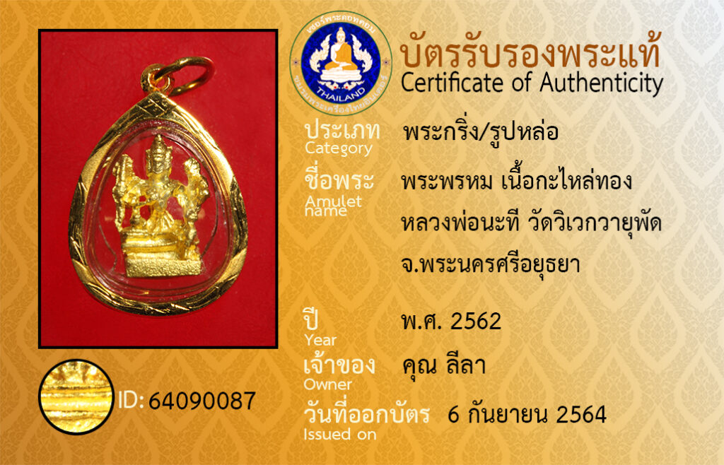 ชื่อพระ : พระพรหม เนื้อกะไหล่ทอง หลวงพ่อนะที วัดวิเวกวายุพัด จ.พระนครศรีอยุธยา