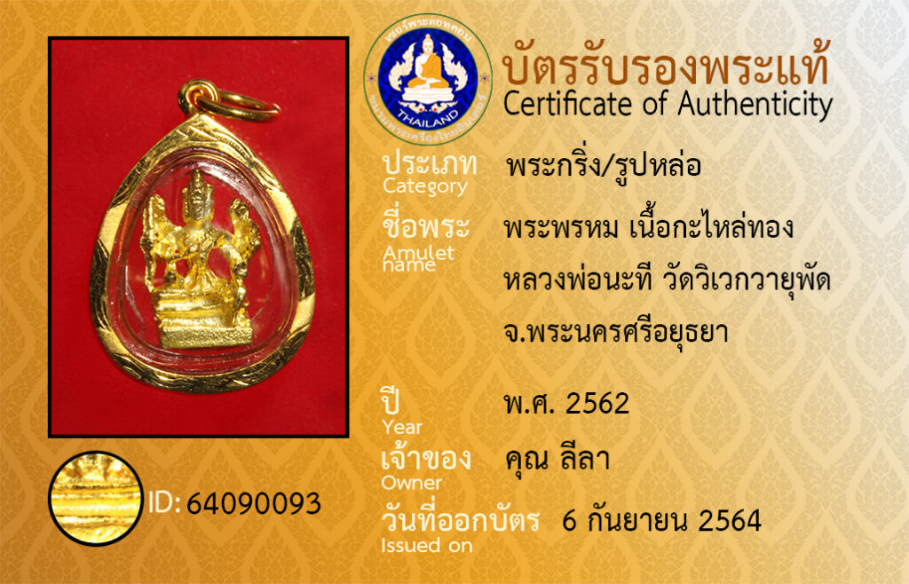 ชื่อพระ : พระพรหม เนื้อกะไหล่ทอง หลวงพ่อนะที วัดวิเวกวายุพัด จ.พระนครศรีอยุธยา