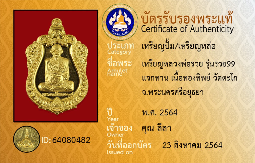 ชื่อพระ : เหรียญหลวงพ่อรวย รุ่นรวย99 แจกทาน เนื้อทองทิพย์ วัดตะโก จ.พระนครศรีอยุธยา